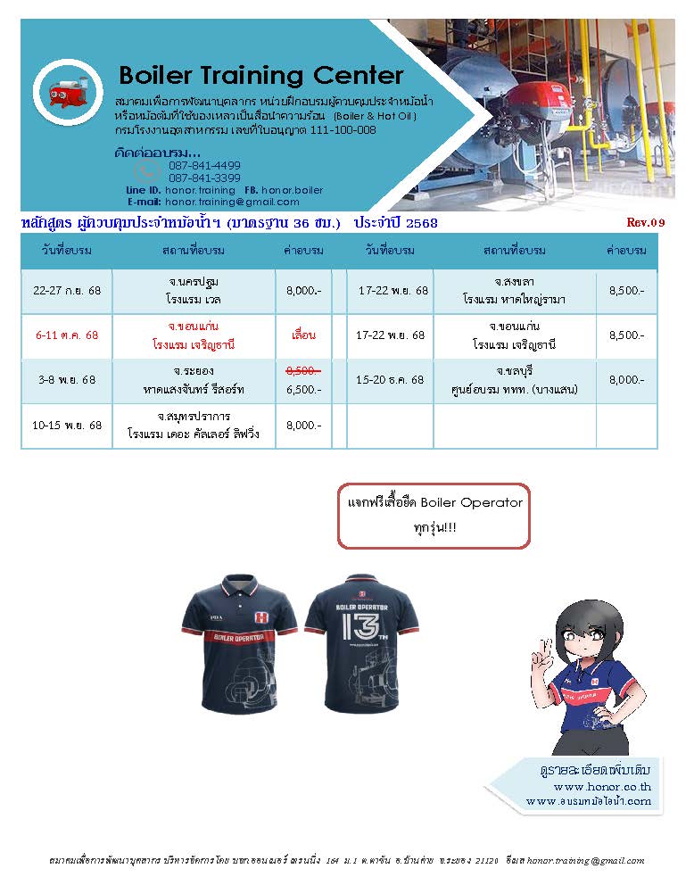 | 5 -10 ต.ค. 69 | ผู้ควบคุมประจำหม้อน้ำฯ (36 ชั่วโมง) @ขอนแก่น [โรงแรม เจริญธานี] | 9,000.- 8,500.- | Class room | ใบสมัคร |